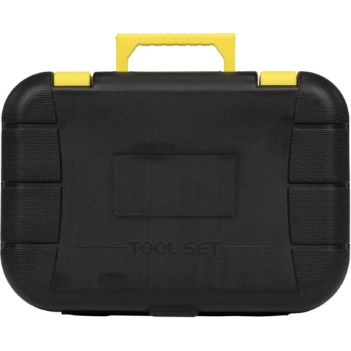 Sounion 16-piece tool box. Tool case with click-mechanism locks and foldable carrying handle contains claw hammer, 4mm flat screwdriver, combination plier, cutter knife with locking feature, hex key holder containing 5 hex keys (2-6mm) with standard and ball ends. 3m measuring tape with locking system, voltage tester screwdriver, electrical tape and 4 precision screwdrivers. ABS Plastic.